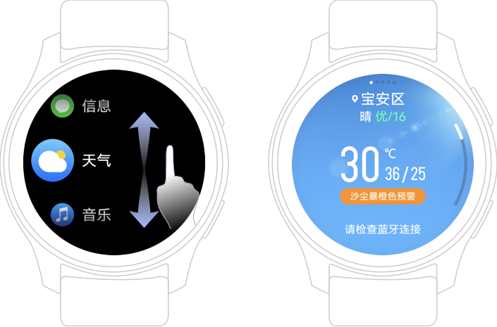 将手表切换至支持天气显示的表盘,在屏幕上可获取最新的天气信息。