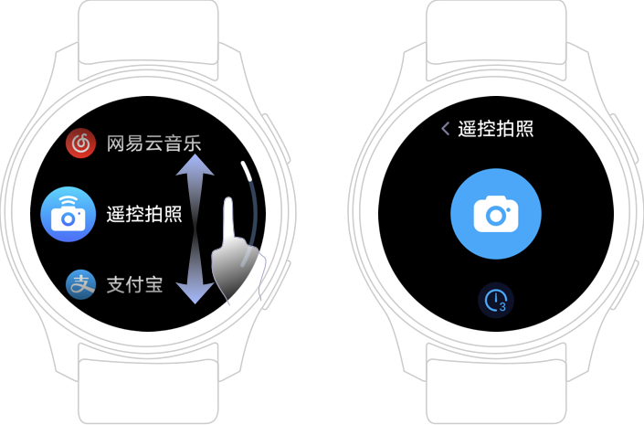 确保手表和手机连接正常后,打开手机相机功能,在表盘界面短按【上键】进入应用列表,上下滑动屏幕进入“遥控拍照”,点击界面中间的
