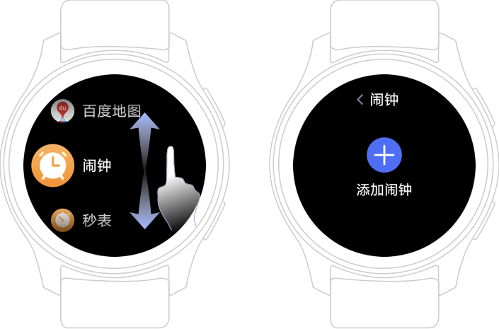 1.在表盘界面短按【上键】进入应用列表,上下滑动屏幕,进入“闹钟”。