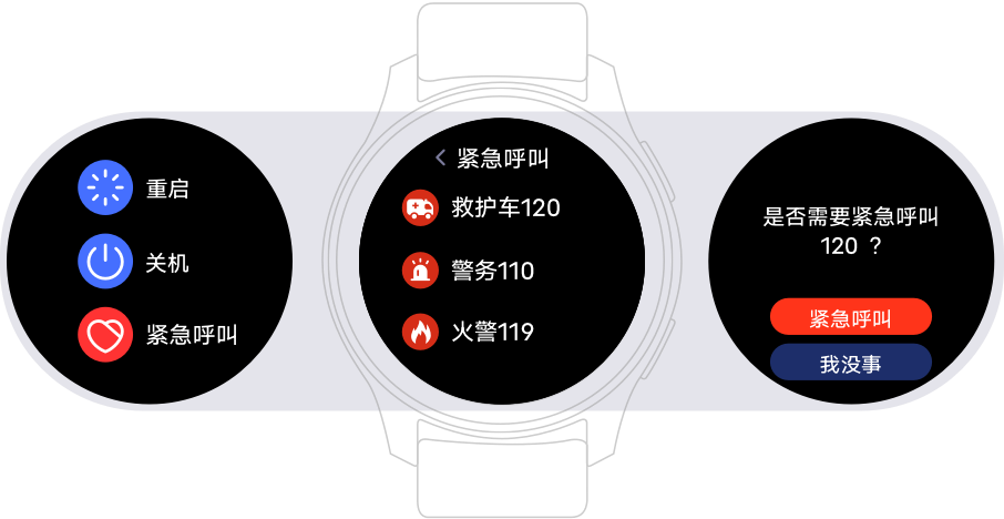 长按【下键】10秒以上进入“重启”/“关机”/“紧急呼叫”界面,点击【紧急呼叫】按钮,出现紧急联络号码选择界面,点击拨打对应紧急号码。